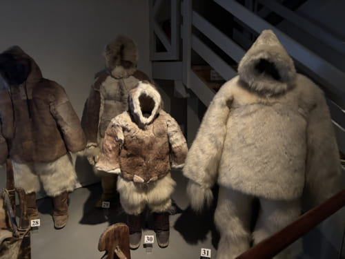 Warm-looking clothing made from animal skins. The one on the right is made from polar bear skin.