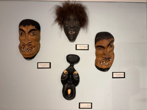 The wooden masks hung up throughout the museum were once used in Inuit rituals and stories. Their exaggerated expressions, tinged with humor and fear, symbolize communication with the spirits and other worlds. They are exhibited as “faces as a symbol of faith” rather than as decorations.