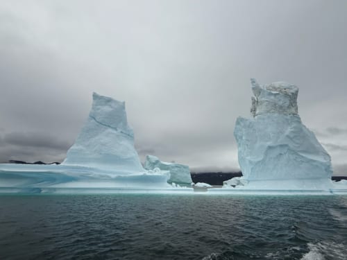 The floating ice pieces we see from the ship in Ilulissat Harbor are all icebergs broken off from glaciers. They range from towering icebergs to small chunks of ice.