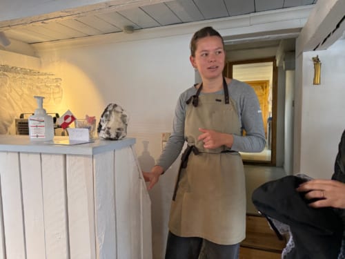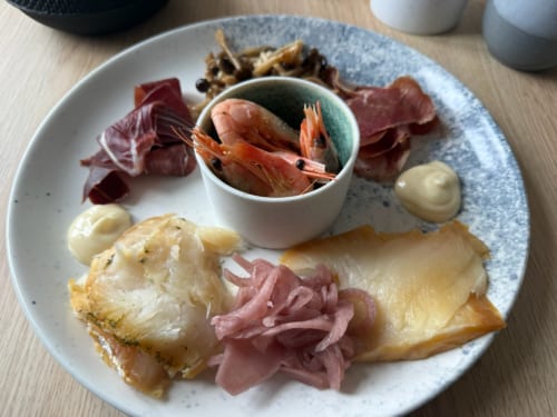 There was only one choice on the lunch menu, and it was priced at 695 DKK (this varies depending on the season). Our lunch was a platter of two types of cold-smoked fish and two types of meat. The plate featured venison in the upper left, lamb in the upper right, halibut in the lower left, cod in the lower right, and shrimp caught in Disko Bay in the center.