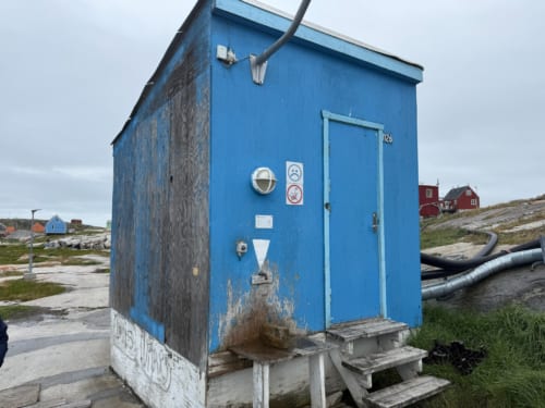 This is the only water supply in the entire town of Oqaatsut. The village has no running water; it relies on desalinated seawater. They have a harsh, but simple lifestyle, with everyone coming to get water from the sole tap in Oqaatsut. The restaurant’s restroom was also unique, featuring a simple toilet that didn’t use water.