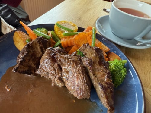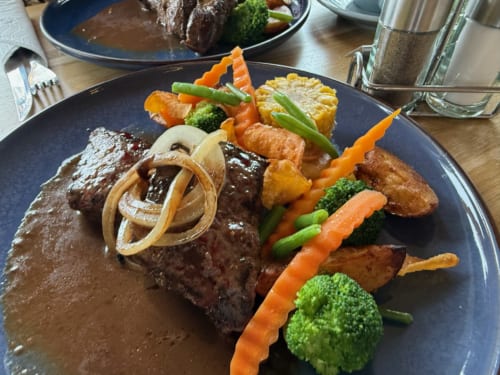This is whale steak, 285 DKK. The flavor of the meat was quite strong, although the seasoning was simple. It has a slightly gamey taste, so opinions may be divided.