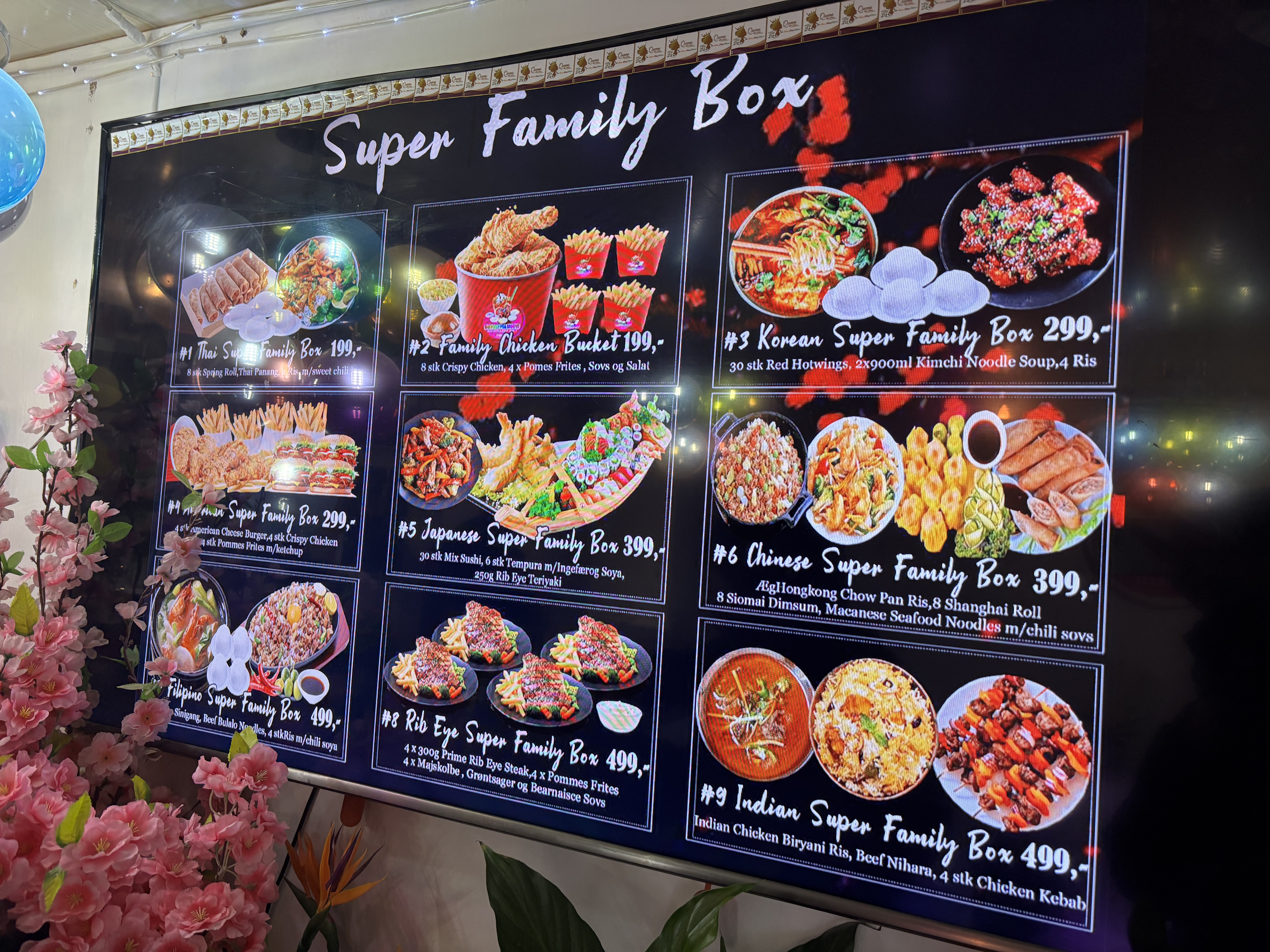 We ordered the Japanese Super Family Box for 399 DKK. The sushi served in the warm restaurant was generously topped with mayonnaise. The staff, who had come to this cold northern land from the Philippines, a hot country, were very friendly.