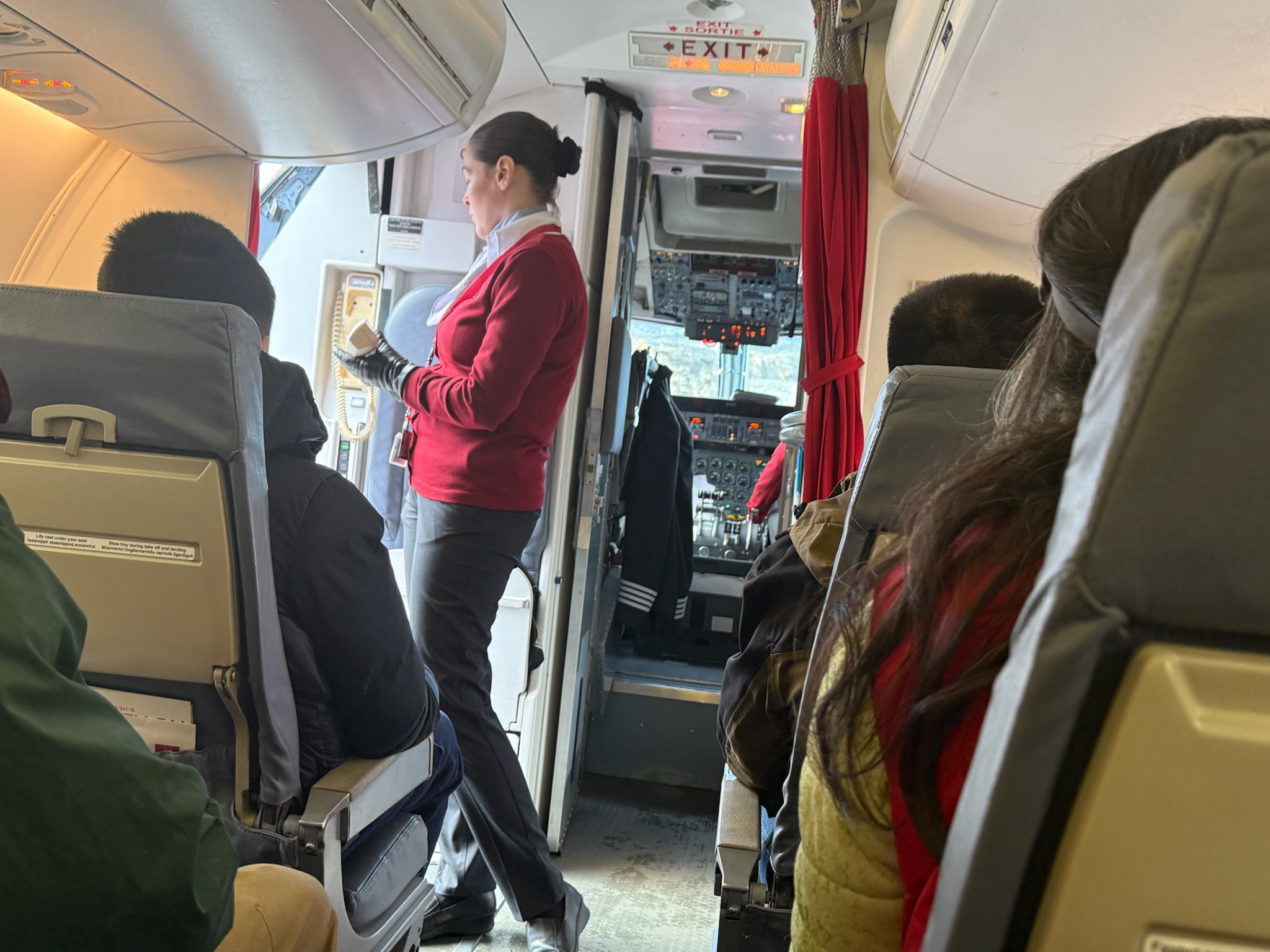 The cockpit was clearly visible from inside the cabin, separated only by a curtain.