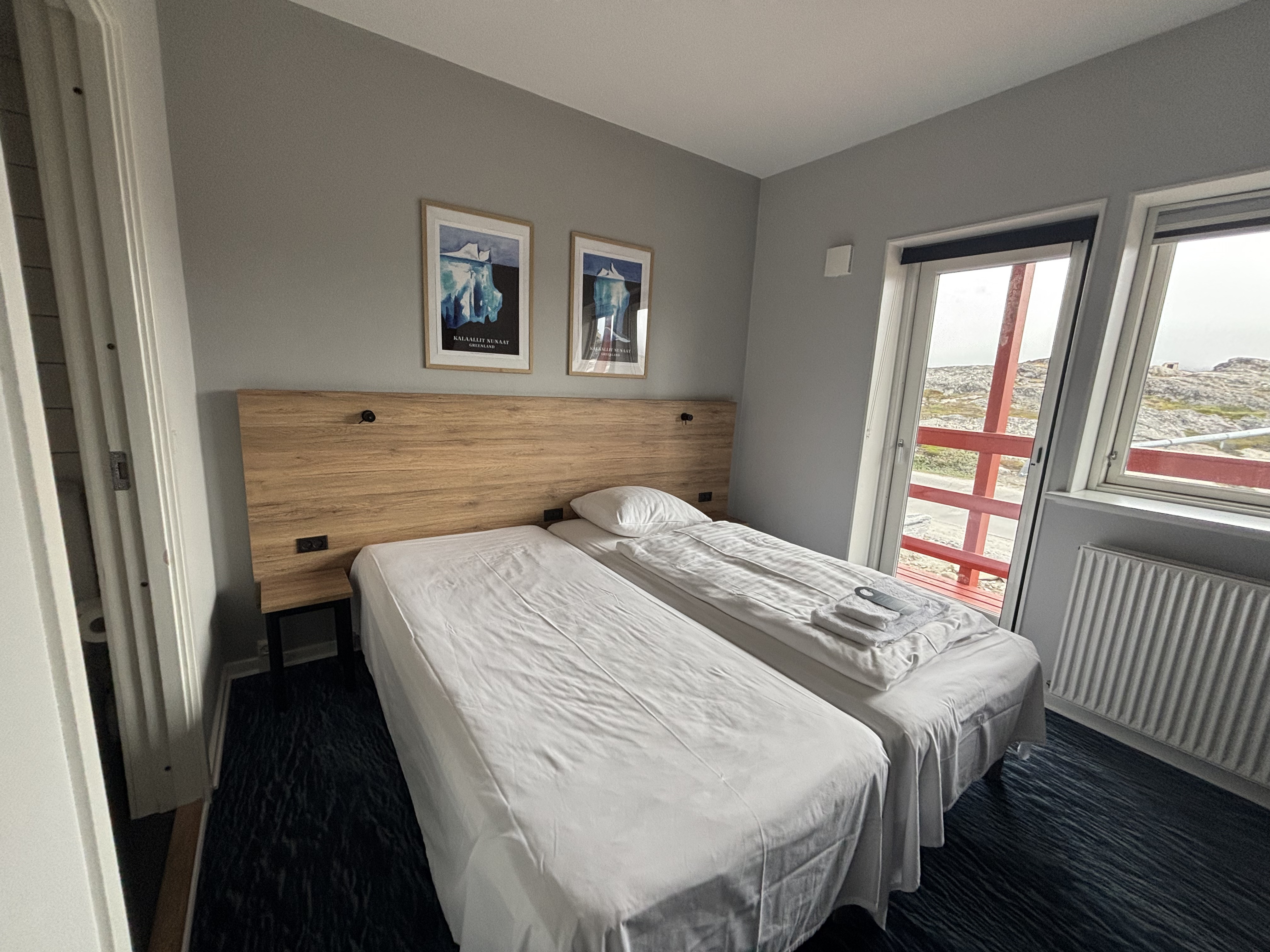 From the airport, we took a complementary shuttle bus to the hotel. The hotels we stayed at were the HOTEL SØMA Ilulissat and the Hotel Arctic, five minutes apart. The HOTEL SØMA Ilulissat, nestled against the mountains, was more spacious and comfortable than I had imagined, with a relaxing atmosphere.