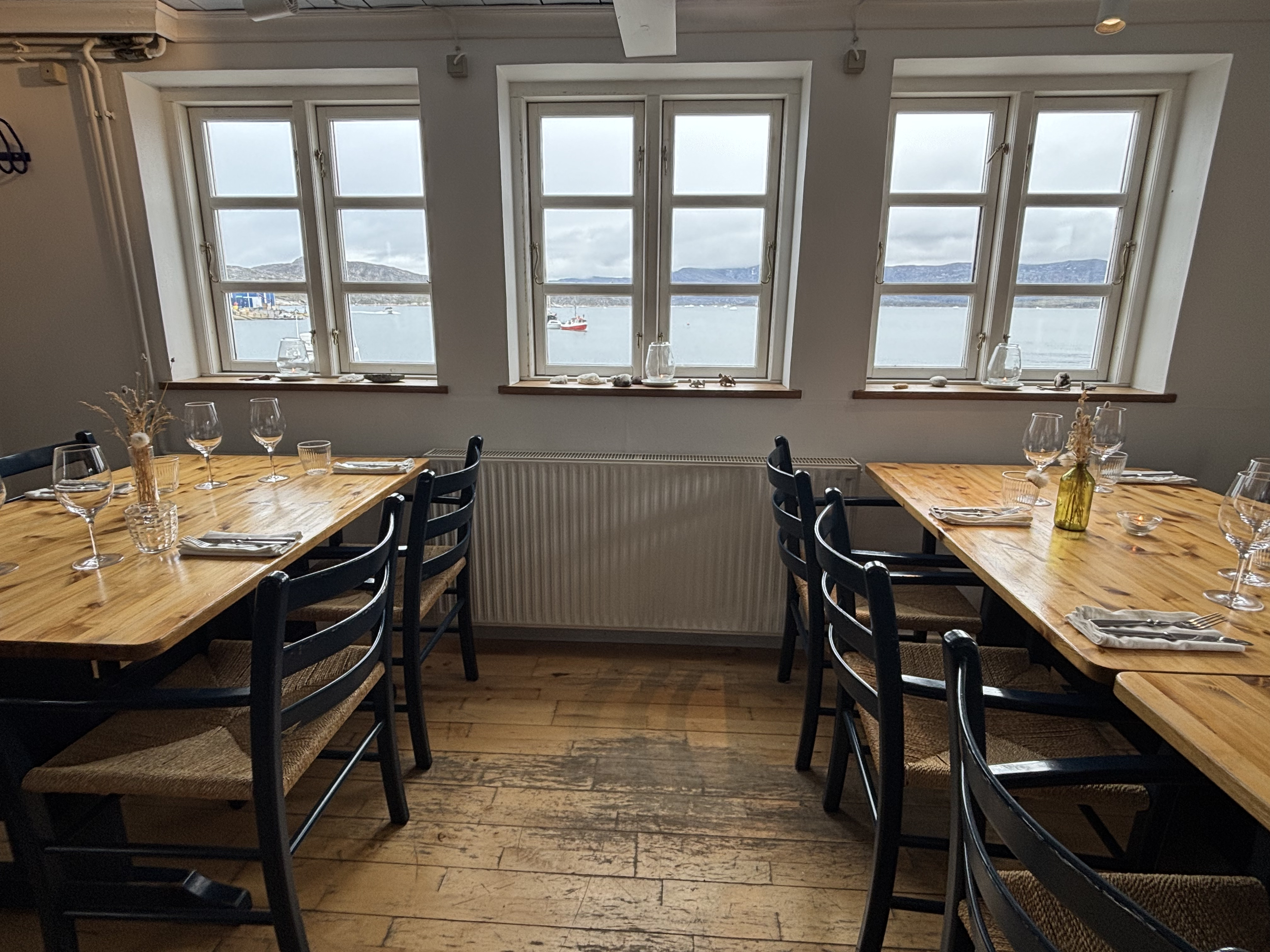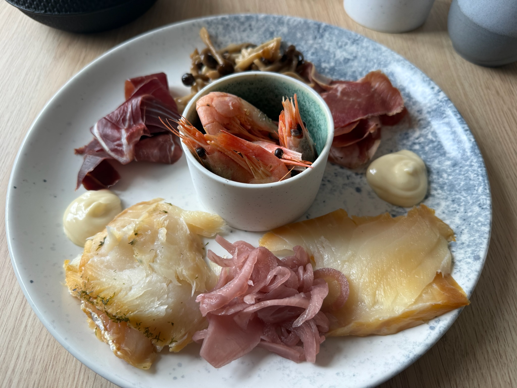 There was only one choice on the lunch menu, and it was priced at 695 DKK (this varies depending on the season). Our lunch was a platter of two types of cold-smoked fish and two types of meat. The plate featured venison in the upper left, lamb in the upper right, halibut in the lower left, cod in the lower right, and shrimp caught in Disko Bay in the center.